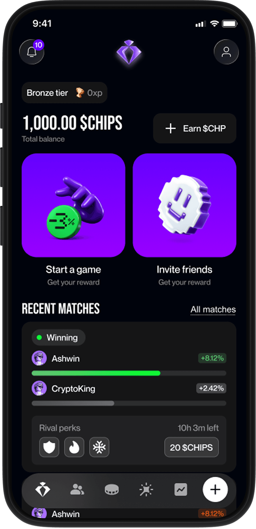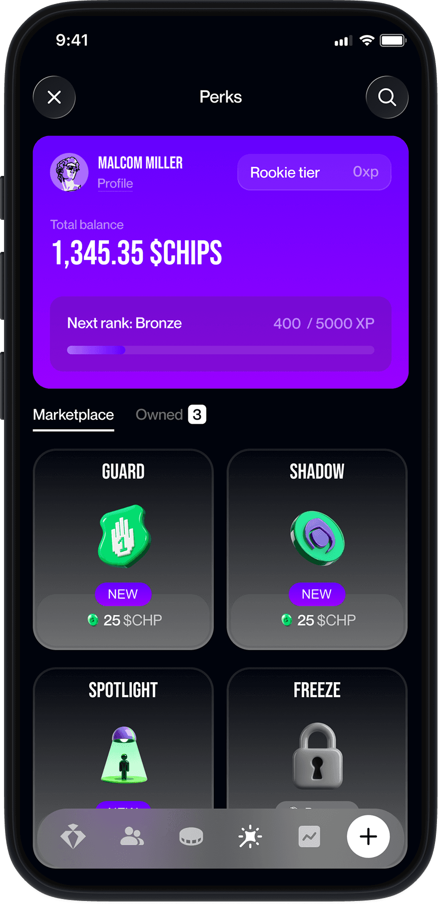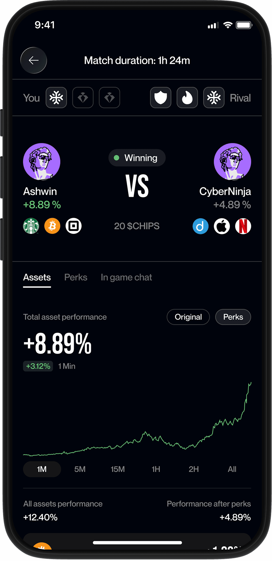 Perks are in-game power-ups that add a strategic layer to every match. They fall into three categories, Defensive (like Guard and Fortress), Offensive (like Flame and Flip), and Strategic (like Shadow). You can use up to 3 perks per match, with each slot unlocking as the match progresses. Higher-tier perks become available as you level up, giving you more ways to protect your portfolio or disrupt your opponent's.
